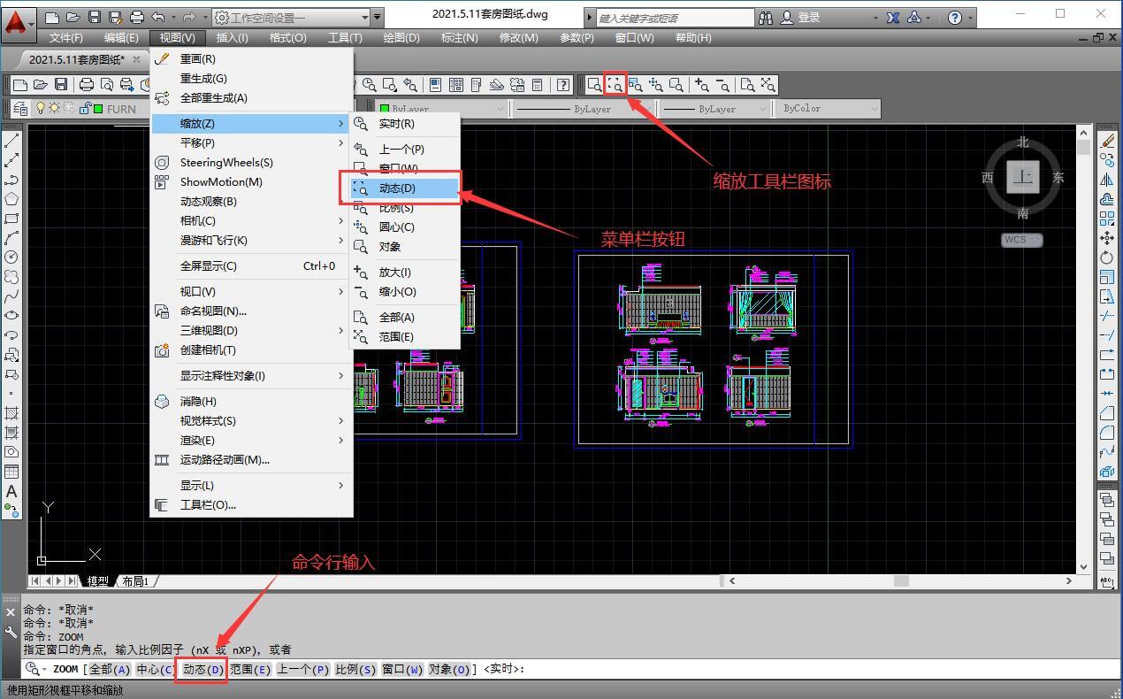 AutoCAD动态缩放相当于照相机的可变焦距镜头,调整当前视图,这样可以观察较大的图形范围和图形细节,而图形的实际尺寸不发生改变。 操作方式 命令行:ZOOM→D 菜单栏:视图→缩放→动态 缩放工具栏: