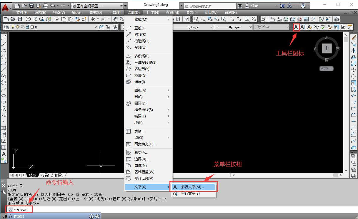 多行文本标注 1.执行方式 命令行:MTXET 菜单栏:绘图→文字→多行文字 文字工具栏:多行文字图标